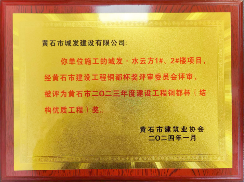 近日,由黃石市城發(fā)建設(shè)有限公司承建的城發(fā)·水云方項(xiàng)目榮獲黃石市2023年度建設(shè)工程安全文明施工現(xiàn)場和結(jié)構(gòu)優(yōu)質(zhì)工程獎。