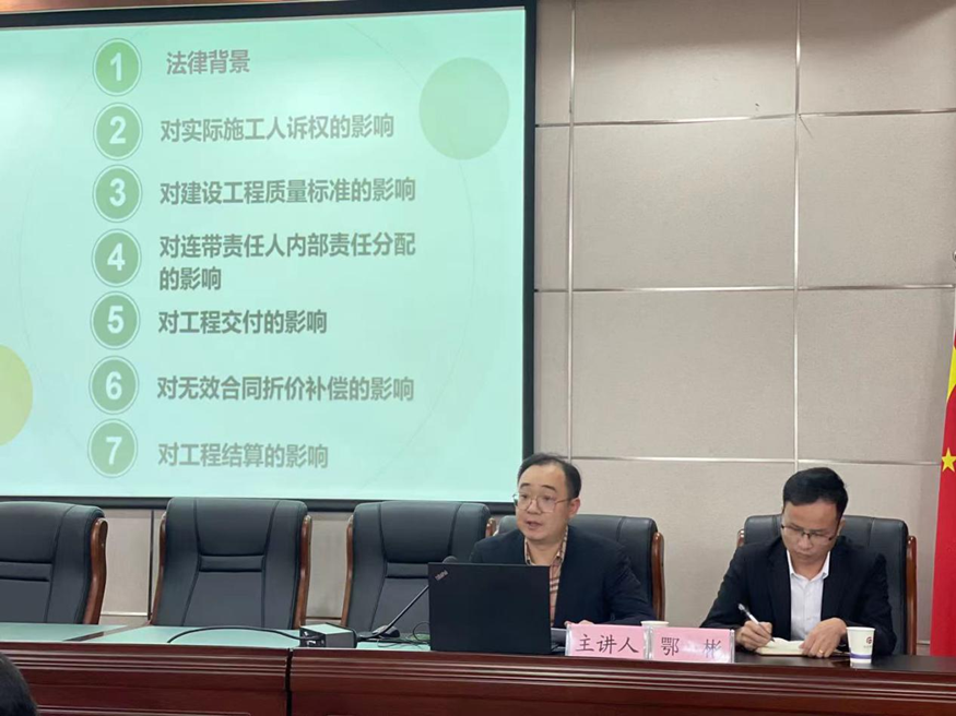 活動(dòng)邀請湖北易圣律師事務(wù)所鄂彬律師擔(dān)任主講,鄂律師從《民法典》對施工人員訴求、工程質(zhì)量標(biāo)準(zhǔn)、內(nèi)部責(zé)任分配、工程交付、合同折價(jià)補(bǔ)償、工程結(jié)算等六大影響作了深入淺出、生動(dòng)細(xì)致的講解,具有很強(qiáng)的針對性和實(shí)用性,使參加培訓(xùn)的人員收獲頗深。