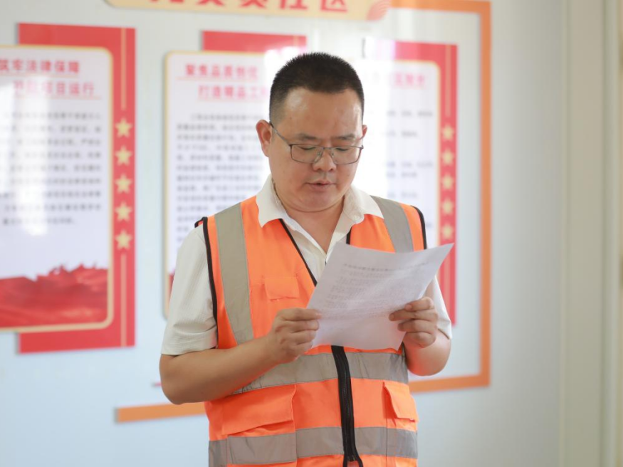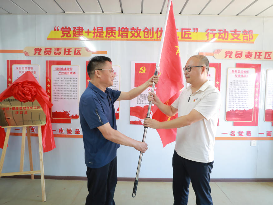 隨后,建工集團(tuán)機(jī)關(guān)黨支部開展“能工巧匠”黨建品牌活動(dòng),學(xué)習(xí)宣貫了清廉項(xiàng)目清風(fēng)工匠行動(dòng)、青年突擊攻堅(jiān)工匠行動(dòng)和提質(zhì)增效創(chuàng)優(yōu)工匠行動(dòng)實(shí)施方案。王鵬同志帶領(lǐng)全體黨員宣讀了廉潔從業(yè)誓詞,崔巍同志和呂成芳同志分別為項(xiàng)目廉潔監(jiān)督員頒發(fā)聘書,廉潔監(jiān)督員代表作了履職承諾。建工集團(tuán)機(jī)關(guān)支部舉行了“建工集團(tuán)青年先鋒突擊隊(duì)”授旗儀式,洪登峰同志將隊(duì)旗授予青年先鋒突擊隊(duì)隊(duì)長。最后全體黨員按照黨員責(zé)任區(qū)分工檢查了項(xiàng)目安全、進(jìn)度、質(zhì)量、經(jīng)營、物資管理、法律風(fēng)險(xiǎn)的情況,并與項(xiàng)目部深入交流,提出改進(jìn)措施和意見。
